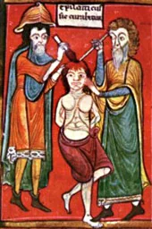 في الصورة يظهر طبيبان يقومان بعلاج مريض بالصرع (القرن الثاني عشر) حيث كان العلاج المعروف في ذلك الحين هو الكي أو التربنة (فتح الجمجمة)، و هما العلاجان اللذان يتلقاهما المريض في هذه الصورة.