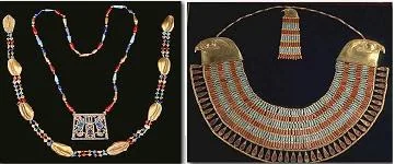 ووفقًا للمؤرخ "سيريل ألدريد" في كتابه مجوهرات الفراعنة، فإن تطوّر الحلي جاء من أصول بدائية استخدمها الإنسان القديم للاتقاء من قوى الطبيعة الغاضبة، مثل الأعاصير والزلازل والفيضانات. وقد بلغت صناعة الخرز عند المصريين القدماء ذروتها مقارنة بأي حضارة أخرى في العالم القديم، نظراً لإيمانهم بجماله وبقواه الروحية.