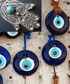 اما الخرزة الزرقاء وتشكل عين في وسط اليد فهي عين الشيطان