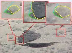 بعد تكبير الصورة بهدف تحليلها نكشف عن منطقة التزييف فيها، تلك المنطقة التي فيها تعبئة مقصودة بلون أبيض واضح تحت الصخرة مباشرة ( أنظر المنطقة المحاطة بلون أحمر في الصورة المكبرة للصخرة المزعومة) تم ذلك بهدف إخفاء ما تستند إليه و هذا يتم بسهولة من خلال برامج معالجة الصور الرقمية مثل فوتوشوب .كذلك نلاحظ إنقطاع ذلك الشريط الأبيض من الجهتين عند مقدمة السيارة وعند طرفه الآخر وكأنه يلغي ملامح المشهد خلفها ، أغلب الظن أن أحداً صور أحد الصخور الطبيعية والمستندة على أعمدة صخرية قصيرة في منطقة الإحساء ثم قام بتركيبها على مشهد آخر من خلال الفوتوشوب ومن ثم أزال تلك الأعمدة بلون أبيض واضح .ويبقى السؤال هنا :ما هي الغاية وراء تلك الإكذوبة ؟ خصوصاً أنها تزعم حدوثها في شهر أبريل الذي تترافق معه كذبة أبريل- نيسان، إقرأ عن الأدلة المزيفة وأهدافها لتكتشف الأسباب.شاهد الفيديو