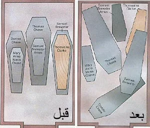 ير مكانه ، والتابوت الوحيد الذي تركوه دون تغيير هو التابوت الخشبي المكسور للسيدة (غودارد) خشية التسبب بضرر إضافي له، في هذه المرة أمر حاكم الجزيرة (لورد كومبرمير) الخبراء من محققيه بإجراء تحقيق في الأمر وفعلاً فحصوا كل ما في المدفن فلم يعثروا على أي شيئ غير عادي ثم وضعوا التوابيت جنباً إلى جنب وفرشوا طبقة من الرمل على أرضية المدفن بغية أن تظهر آثار أقدام مقترفي الجريمة. وأسندوا تابوت السيدة (غودارد) الخشبي إلى حائط المدفن ، ومن ثم أغلق المدفن ووضع ختم الحاكم محفوراً عليه ، والجميع في الجزيرة كانوا بانتظار الفرصة التالية لإعادة فتح المدفن .- لم تأت المحاولة اللاحقة لفتح المدفن بسبب وجود ميت لدفنه وإنما أتت بناء على أوامر الحاكم وبدافع من الفضول ففي 18 أبريل 1820 سافر الحاكم وعدد من الأصدقاء إلى المدفن ووجد أن خاتمه على حاله لم يمسسه سوء، وعندما فتحوا المدفن وجدوا التوابيت في غير أماكنها حتى أن بعضها كان رأساً على عقب ولم تكن هناك آثار أقدام على الأرضية المفروشة بالرمل ! ، وهكذا نقلت التوابيت من المدفن ودفنت في أماكن أخرى على الجزيرة وبعد فحص المدفن تبين أنه لا يحتوي على الماء ولا يوجد طريقة لنفاذ الماء إليه ، واستبعد أن تكون الزلازل هي السبب فكيف للزلزال مثلاً أن يؤثر على بقعة محددة من حجرة المدفن من دون أن يؤثر على التابوت الخشبي.