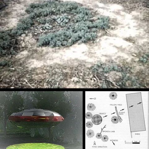 كانت توجد أنوار متعددة الألوان على الجسم الذي كان متوقفاً دون حراك على ارتفاع 50 سم عن الأرض تقريباً. حاول (رون) إلقاء نظرة قريبة، لكن الأنوار المنبعثة من المركبة كانت شديدة التوهج لدرجة إنه لم يستطع تحديد أية تفاصيل دقيقة عن اليوفو. وصرح (رون) بأن كان الجسم يصدر صوتاً وصفه بأنه يشبه هدير الإرتجاج الذي تحدثه غسالة ملابس قديمة الطراز ، بدأ اليوفو بالارتفاع نحو السماء، وبينما كان يفعل ذلك كان الضوء يزداد سطوعاً أسفله إلى درجة أن (رون) كاد يصاب بالعمى من شدة توهج الأنوار.