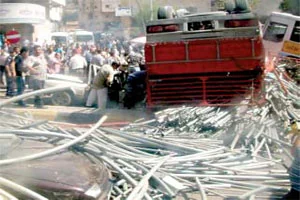 " وقع ظهر أمس حادث سير مروع تسبب به تدهور شاحنة محملة بالاعمدة الحديدية وأدى الى مجرزة مرورية وسط مدينة عجلون أسفرت عن وفاة 6 أشخاص واصابة 27 اخرين ، 3 منهم اصابتهم خطيرة إضافة الى أضرار مادية لحقت بالمركبات والبنى التحتية بالموقع. وفي التفاصيل فقد وقع الحادث في تمام الساعة 12:30 ظهراً وعندما كانت الشاحنة قادمة من اربد باتجاه وسط مدينة عجلون حيث فقد السائق السيطرة على الشاحنة قبيل وصوله الى وسط مدينة عجلون الأمر الذي تسبب بانقلابها على المركبات التي تواجدت في الموقع وتطايرت منها الاعمدة الحديدية على الشارع الذي كان يشهد ازدحاما كثيفاً بالمارة وطلبة المدارس. وهرعت على الفور أجهزة الأمن العام والدفاع المدني في عجلون واسناد الشمال حيث قامت باخلاء الوفيات والمصابين الى مستشفى الايمان الحكومي الذي استنفر كافة طواقمه لمواجهة ما أسفر عنه الحادث المروري من الاعداد الكبيرة من الوفيات والاصابات.