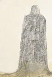يقف على سطح مصعد كهربائي ، ووصفته بأنه يشبه رجل متلفح بستارة سوداء ، وعندما حدقت به لعدة لحظات غرق ببطء واختفى تحت سطح الخور ثانية، لكنها لم تشعر بالخوف وذهبت مباشرة إلى منزلها ورسمته كما هو مبين هنا.