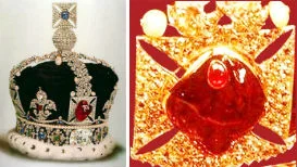 من لون الملكية إلى لون الإنتقام ، كان لـ ياقوتة الأمير الأسود أيضاً ماض غني بالقصص . شهد عام 1367 أول ظهور معروف لهذه الياقوتة التي تزن 170 قيراطاً حينما قام (دون بيدرو) ملك قشتالة والملقب بـ (المتوحش) بقتل صاحب الياقوتة ، وفي وقت لاحق احتاج لمساعدة من أحد أعدائه في معركة (ناغيرا) فأعطى الياقوتة إلى (إدوارد) ملك (ويلز) مقابل مساعدة منه في معركته وهذا الملك كان يلقب شعبياً باسم "الأمير الأسود"ومنه أخذت الياقوتة اسمها . وبعدها ارتدى تلك الجوهرة (هنري الخامس) في خوذته المرصعة وذلك في معركة (أغينكورت) وبينما كان الحصول على التاج شهد صراعاً فإنه جلب الحظ الجيد لـ هنري مع دوق ألينكون.