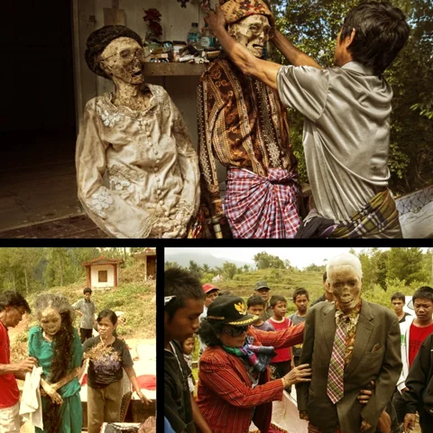 الصورة المبينة أعلاه تداولتها مواقع عديدة على الإنترنت وهي تظهر جثة امرأة تعود ماشية إلى مكان ولادتها لتحصل على راحة في مثواها الأخير وهي تنتظر لحظة وضعها في التابوت. والكثير من الناس وجد أن هذه الصورة مجرد خدعة، أو انهم نفوا على الأقل أن تكون جثة ماشية تنتظر لحظة دفنها الاخيرة، لكن المزيد من البحث كشف أن هناك طقساً آخر يقوم بها شعب (توراجا) على موتاهم، وحصلنا على فيديو يوضح القيام بهذا الطقس ، عندما يموت أحد أفراد شعب (توراجا) يوضعون في الأغلب في توابيت ومن ثم توضع التوابيت داخل قبور مصنوعة من حجر صلب وذلك عند أعلى منحدرات الحجر الجيري، لذلك فإن الجثة في الواقع لا تدفن في باطن الأرض، ولهذا يكون هذا الطقس ممكناً، ويسمى بطقس مانينيه (طقس تنظيف الجثث)، هذا الشعب يولي إحتراماً كبيراً لموتاه وللحياة الآخرة، فكل عدة سنوات ترفع التوابيت من القبور ومن ثم ترفع الجثث من التوابيت وتنظف ويلبسونها ملابس جديدة، كما يقومون أيضاً بصيانة ما تضرر من التوابيت أو حتى إستبدالها.