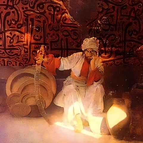 فيما يروي العلاء بن ميمنون الآمدي أن عاصفة أوقعت أبيه ورجل من قريش في جزيرة بالبحر بها "شجر طوال، وطيور منكرة"، وفيها رأوا شيخًا مستند لشجرة عظيمة، زعم لهما أنه كان يلقي الشعر في نفس الحارث بن مضاض الجرهمي خلال حرب قومه مع خزاعة، ثم سأل عن الرسول فأخبراه أنه مات من 40 عامًا، فحزن بشدة وأنشد: "ولرب راج حيل دون رجائه ومؤمل ذهبت به الآمال " .