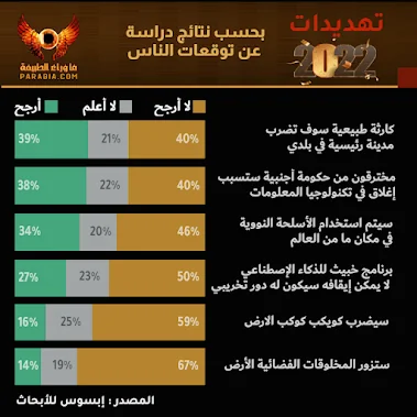 في أواخر ديسمبر الماضي نشرنا استبياناً مصدره شركة إيبسوس للأبحاث وهو قد يكون دلالة مهمة على "الوعي الجمعي" للكوارث المحتملة في عام 2022 ، فحكمة المجموعة تغلب أي توقعات لعراف منفرد. وفيه رجح 34% من المشاركين (22 ألف شخص) في الإستبيان الذي نشرته شركة أبحاث إيبسوس (وهو يبقى احتمال كبير) في وقوع حرب نووية، وكان من بين رأس القائمة من الترجيحات هو شن هجوم إلكتروني يشل الإنترنت بنسبة 38%، وبالفعل شهدنا بعض ملامحه حتى الآن عندما شن الروس هجمات إلكترونية على مواقع أوكرانية ، والآن نشهد سلسلة من الحظر على الإعلام الإلكتروني بين روسيا والغرب في وسائل التواصل ومواقع أخرى وغيرها والأمر مرشح لأن يتضخم لما قد يصبح حرب إلكترونية شاملة قد تشل الإنترنت. علماً أن الإستبيان جرى بين شهري أكتوبر ونوفمبر الفائتين.