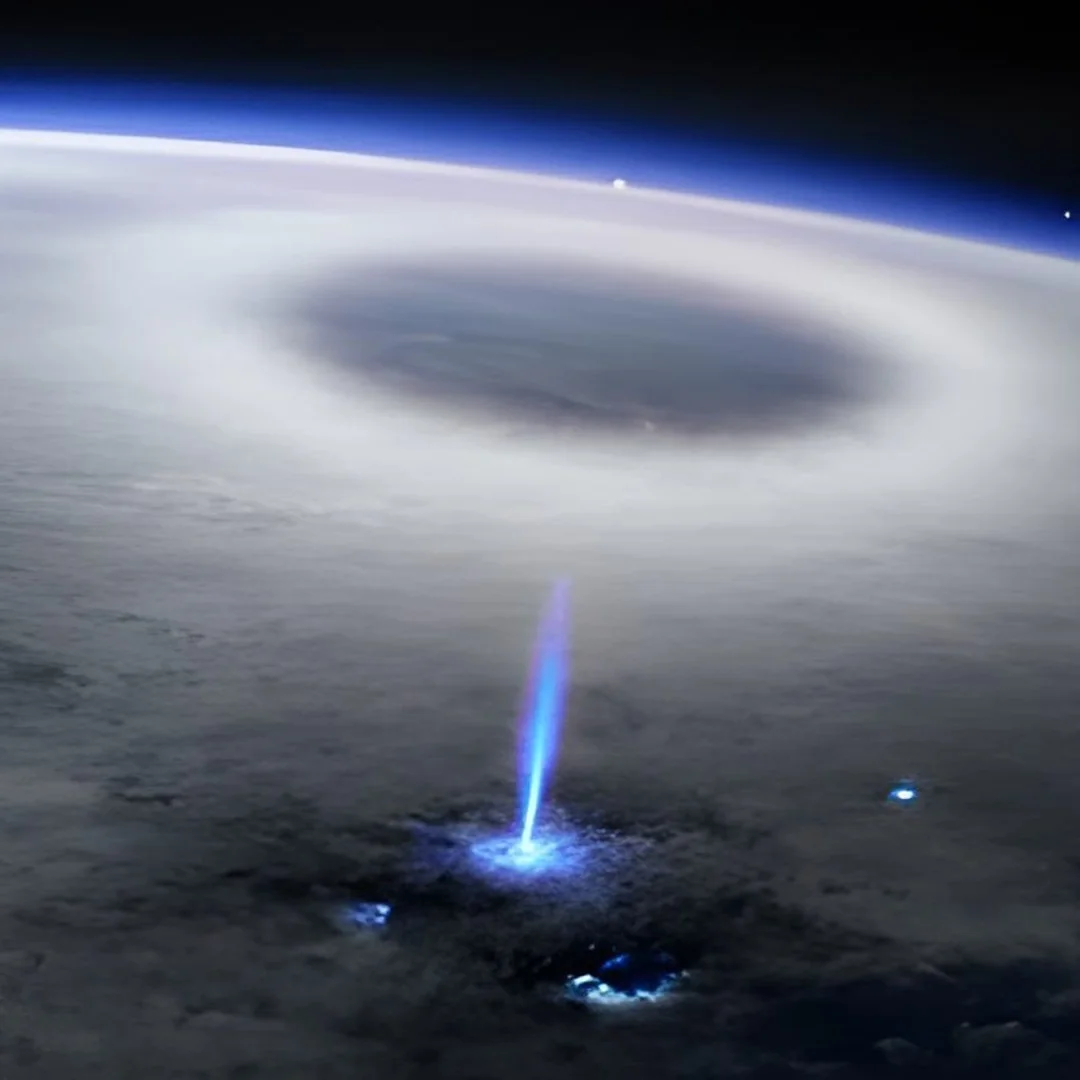 ونلاحظ في الصورة ما رصدته الأجهزة في المحطة الفضائية الدولية وهو مصدر برق غريب يُطلق عليها الضربة الزرقاء وهو نوع غير عادي من البرق في الغلاف الجوي العلوي.