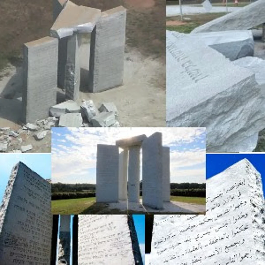 - وبخصوص الرسالة الغامضة الموجهة للبشرية فهي مكتوبة بثماني لغات حديثة وأربع لغات ميتة ويمكنك الإطلاع عليها في مقال موسع بعنوان نصب جورجيا الغامض الذي يلقي الضوء على نظريات المؤامرة أيضاً.