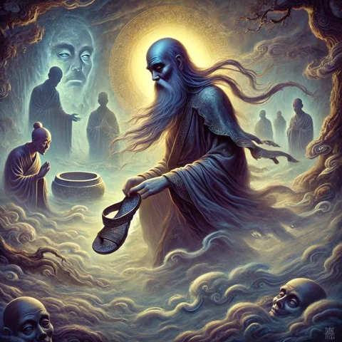 تروي الأساطير الصينية القديمة أن بوديدارما، بعد وفاته في القرن السادس الميلادي، دُفن وفقاً للتقاليد. ولكن بعد فترة قصيرة، زعم مسؤول حكومي أنه رآه يسير في أعالي الجبال، حافي القدمين، يحمل صندلاً واحداً في يده، بينما كانت نظراته مملوءة بحكمة غامضة.