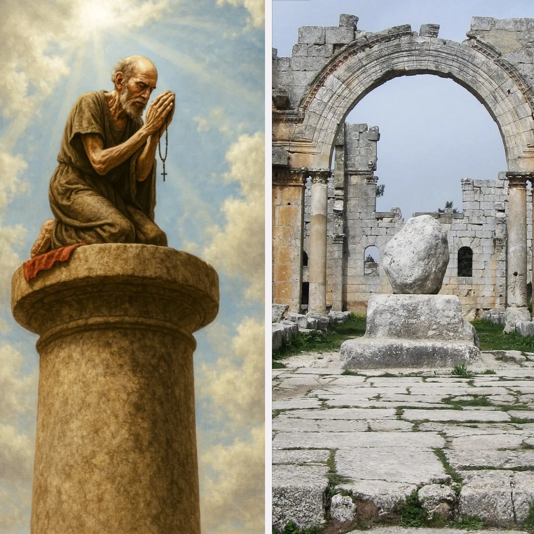 فوق هذا العمود عاش رجل لسنوات طويلة بلا انقطاع، في عزلة شبه كاملة، لكن وسط توافد لا ينقطع من الزائرين. اسمه سمعان العمودي، ولقبه مأخوذ من أسلوبه الفريد في التعبد: اعتلاء عمود شاهق كأنما أراد أن يقترب من السماء جسداً وروحاً.
