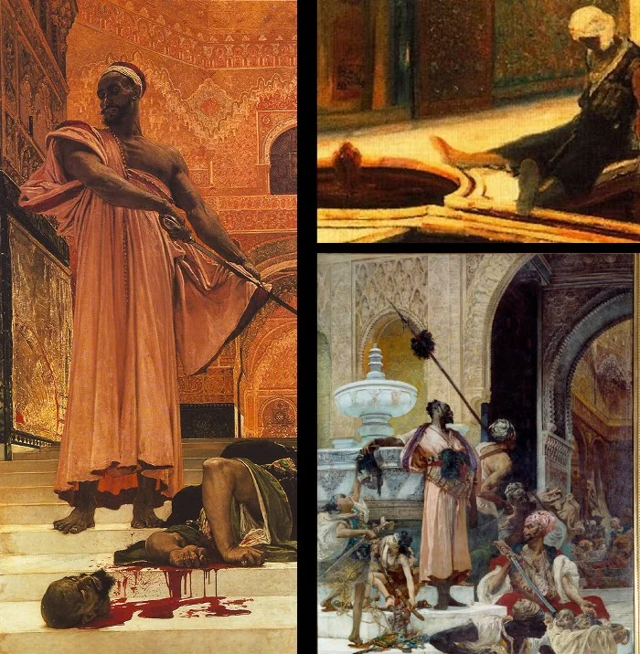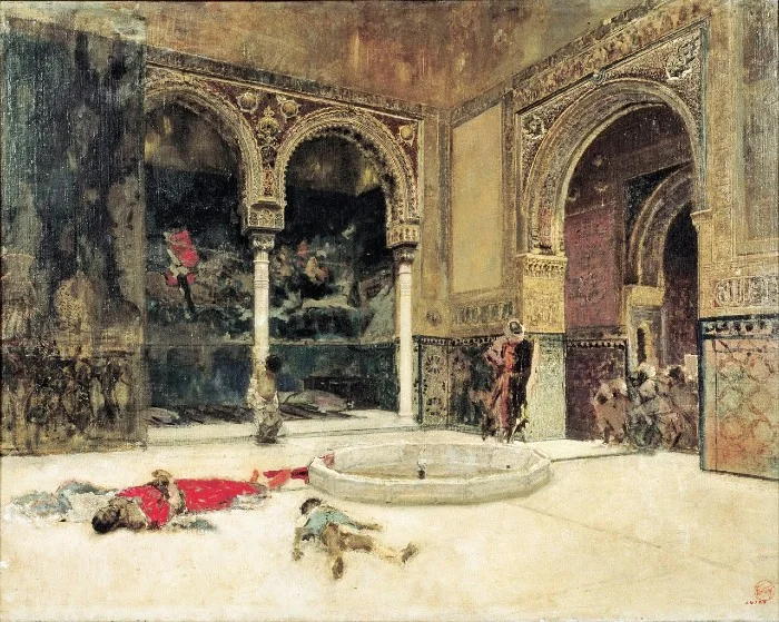بين ردهات القصر، تحتفظ قاعة بني سراج بأسطورة أكثر دموية. فقد ذُبح عشرات الفرسان في مأدبة غدر، وسالت دماؤهم حتى غمرت نافورة القاعة. تقول الحكايات إن الحجارة احتفظت بلونها الأحمر، وأن الزوار أحياناً يرون خطوطاً قاتمة في قاع النافورة، لا تُمحى مهما جرى تنظيفها. البعض يقسم أنه سمع أصوات صليل سيوف وصيحات استغاثة ترتد من الجدران، كما لو أن المشهد يعاد كل ليلة في بعد آخر.