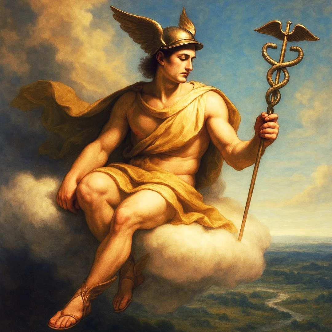 في الأساطير الإغريقية، هرمس (Hermes) هو إله المراسلات والتجارة والدهاء والسفر والحدود، وأحد أبناء الإله زيوس ، كان يُصور على أنه رسول الآلهة، يرتدي القبعة المجنحة والصندل المجنح اللذين يمنحانه سرعة الحركة بين العالمين: عالم البشر وعالم الآلهة ، كما ارتبط بسرقة الماشية والمكر، لكنه أيضاً كان حامياً للتجار والمسافرين واللصوص على حد سواء.