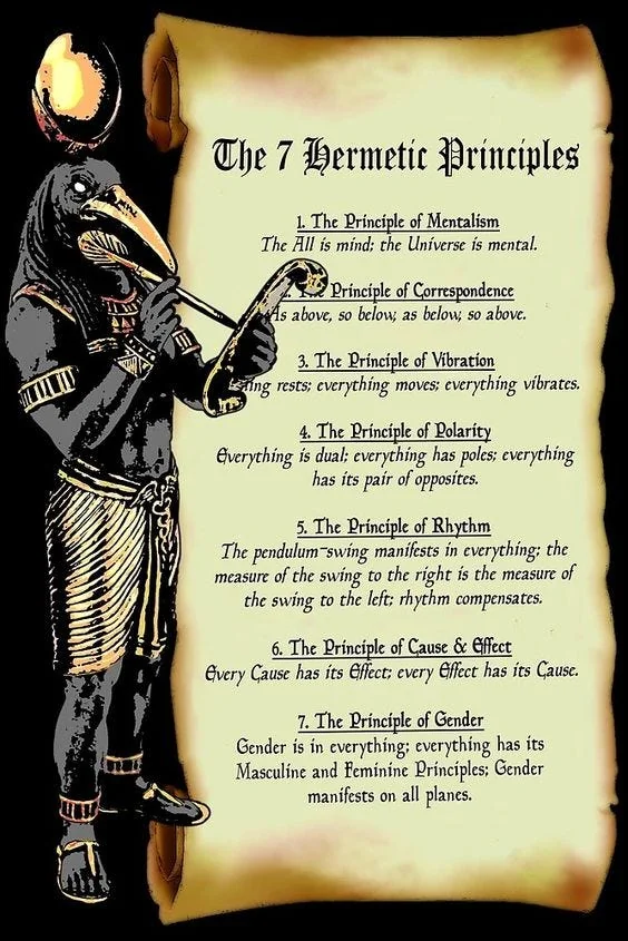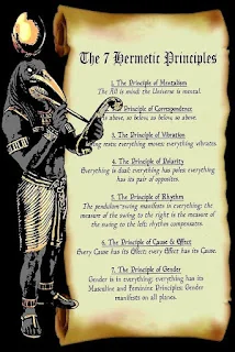 الهرمسية صاغت سبعة مبادئ كونية وردت في كتاب كايباليون (The Kybalion)، وهي أساس الفلسفة السحرية والباطنية الغربية:
