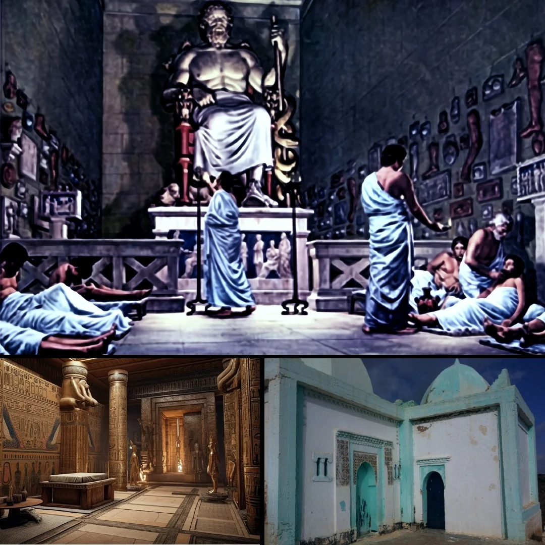 إيمحوتب، المعماري والطبيب الذي أُلّه بعد موته، عُبد كإله للشفاء. معبده في سقارة كان مقصدًا للمرضى منذ الألفية الثالثة قبل الميلاد. تشير البرديات إلى أن الزوار كانوا ينامون في فناء المعبد أو داخله طلبًا للرؤى العلاجية.