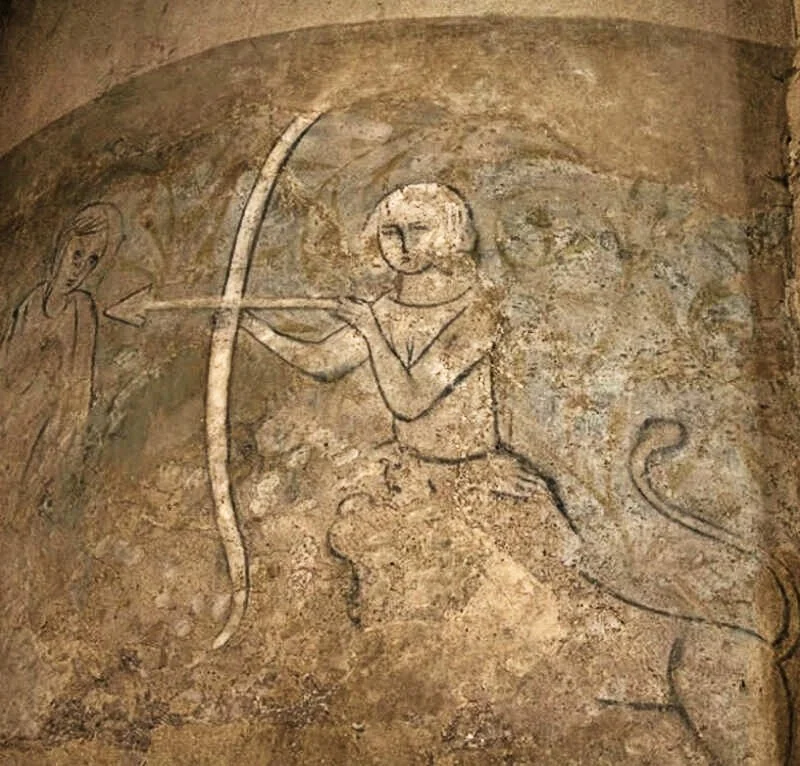 في قلب القلعة تقف الكنيسة الصغيرة التي شُيدت مباشرة فوق الحفرة، وتحتوي على جداريات غامضة. من أبرزها صورة رئيس الملائكة ميخائيل وهو يطعن تنيناً، في إشارة واضحة إلى الصراع بين الخير والشر. لكن الأكثر إثارة للجدل هو رسم لقنطور أنثى (كائن هجين نصفه الأعلى إنسان والنصف الأسفل حصان) وهي تحمل قوساً بيدها اليسرى، وهو تصوير غريب في فضاء كنسي مسيحي، ما غذّى الاعتقاد بارتباط القلعة برموز وثنية وأسرار موروثة من عصور غابرة.