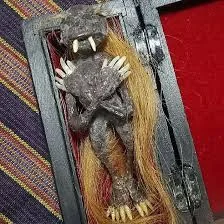 الجينغلوت Jenglot كائن صغير بحجم كف اليد، مغطى بالشعر، يُقال إنه يعيش داخل تمثال أو دمية تُستخدم في الطقوس السحرية، يُعتقد أنه يتغذى على الدم الذي يُقدم له قرباناً في طقوس غامضة.
