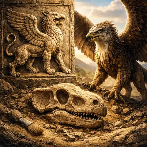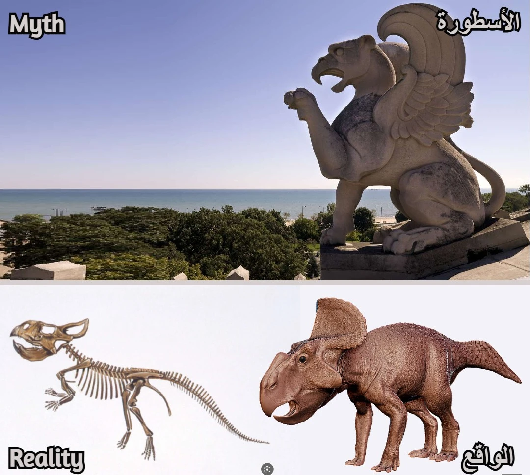 الغريفين مخلوق أسطوري مكون من جسد أسد ورأس وجناحي نسر، ذُكر في الأساطير اليونانية وغيرها. يطرح العلماء فرضية مفادها أن أسطورة الغريفين قد تكون نشأت من اكتشاف عظام ديناصورات قديمة. فبحسب أبحاث عالمة الفولكلور أدريان مايور، ربما عثر الرحالة في منطقة آسيا الوسطى على أحافير لديناصور بمنقار (مثل بروتوسيراتوبس Protoceratops الذي عاش في صحراء غوبي) فظنوا أنها بقايا مخلوق أسطوري.