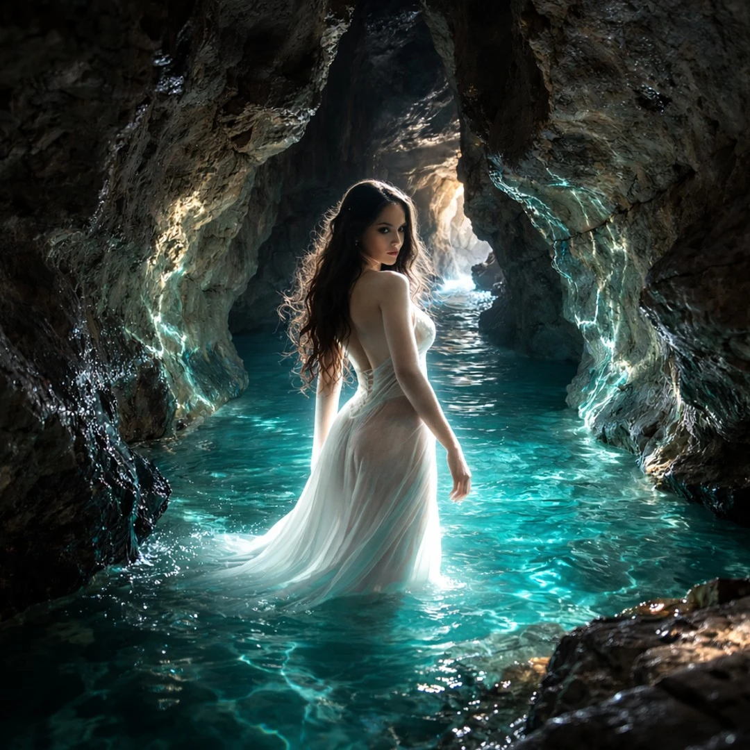 فتاة بيضاء، شعر طويل، تقف عند مدخل الكهف ، تبتسم ، ثم تختفي عندما يقترب أحدهم.