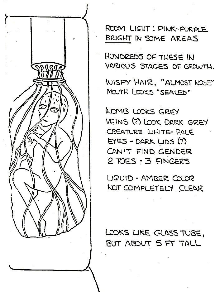 في بعض رواياتها، تصف مشاهد أكثر غرابة. تقول إنها رأت غرفاً تحتوي على أوعية شفافة، بداخلها أشكال تشبه الأجنة، لكن ملامحها لم تكن بشرية بالكامل. كانت تلك اللحظات الأكثر رعباً، لأنها شعرت بأنها ترى شيئاً “قيد التكوين” ، لم تكن متأكدة إن كانت هذه الكائنات نتيجة تجارب… أم أنها مستقبلها المحتمل.