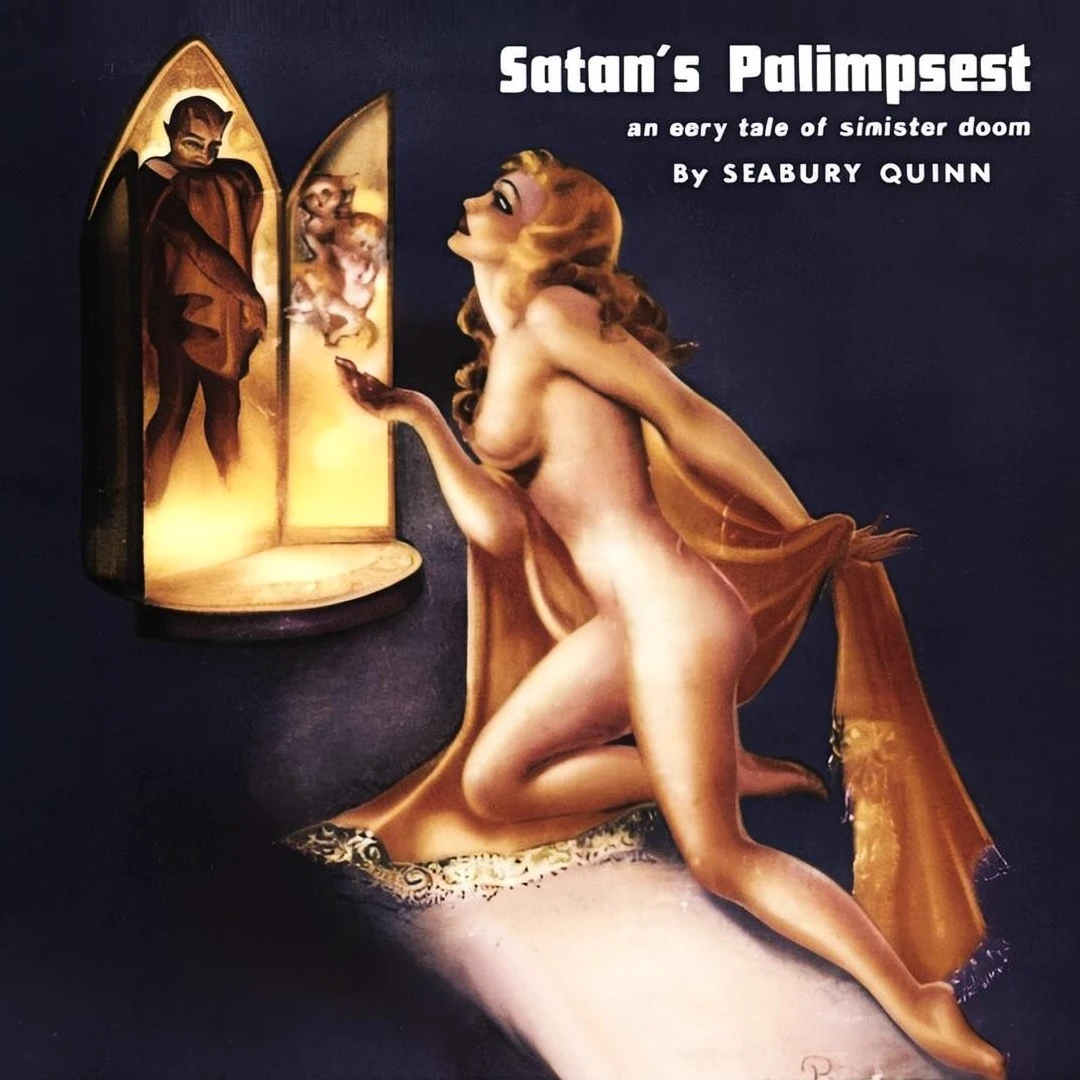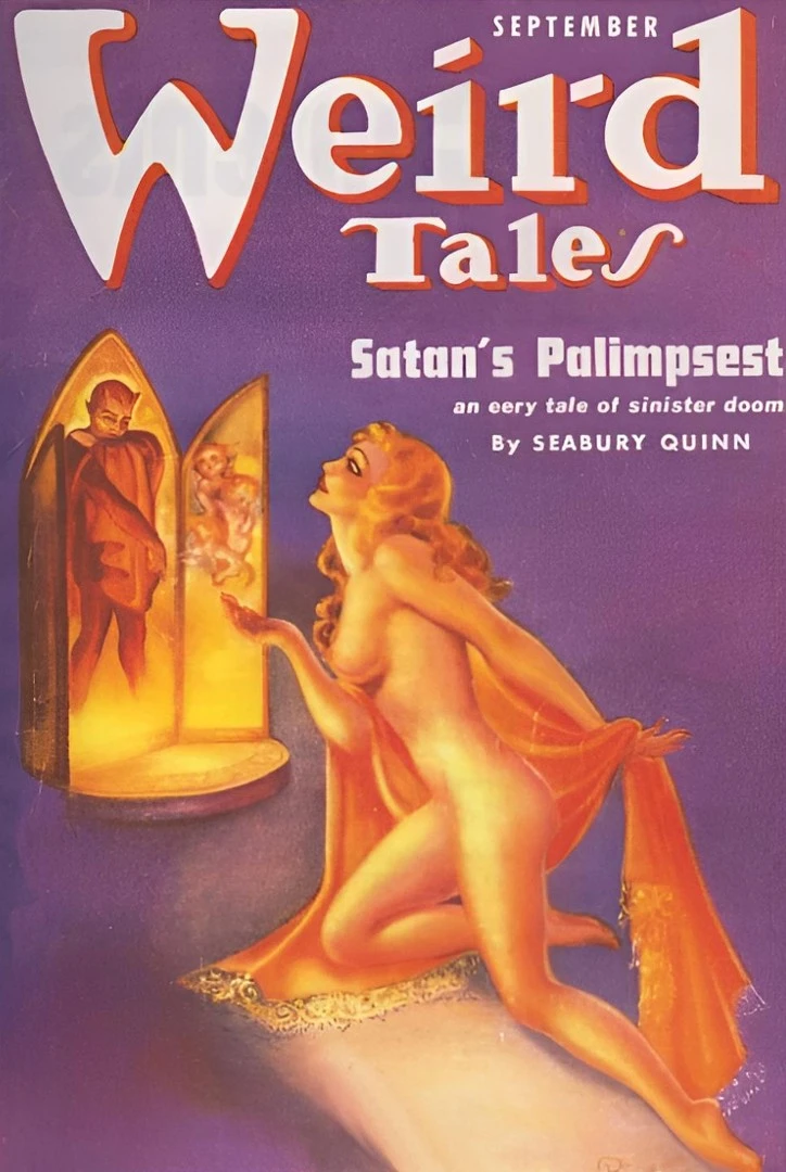 في هذا النوع من القصص كانت الخطيئة والإغواء والجسد والأنوثة الملتبسة بين البراءة والخطر عناصر تتكرر كثيراً، ليس بوصفها “فتنة” فقط، بل كجزء من بناء الرعب نفسه ، وفي حالة Satan’s Palimpsest تحديداً، يبدو هذا البعد أوضح على مستوى الجو العام والتقديم البصري، لا سيما أن غلاف العدد الشهير لمجلة Weird Tales رسم امرأة عارية تقريباً في مشهد مشبع بإيحاءات الخطر والإغواء والشيطنة، وقد لاحظت قراءة أكاديمية حديثة أن هذا الغلاف يمثل بوضوح تداخل الخوف والإثارة البصرية في تقاليد المجلة.